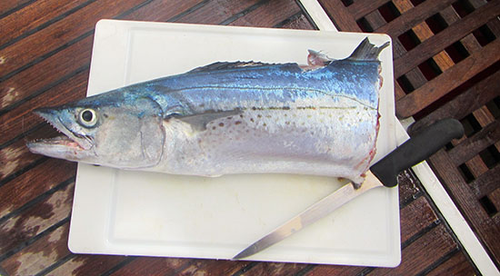 Bonne prise, un thazard maquereau. Dommage, il a été dévoré d’au moins la moitié avant qu’on le ramène à bord.