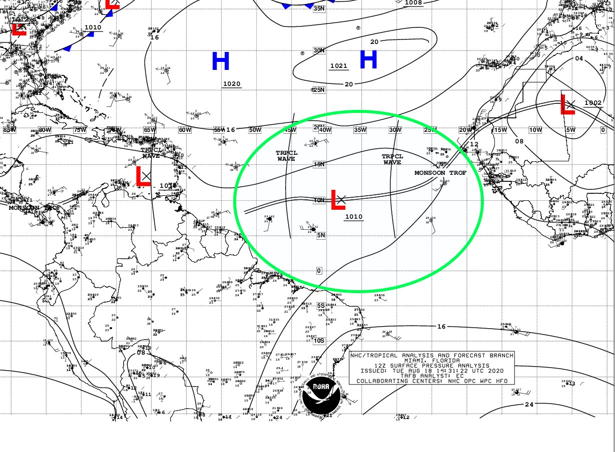 Le renforcement plus lent que prévu malgré les conditions locales plutôt favorables (je parlerai en fin d’article des conditions régionales) est une bonne nouvelle. Cependant un système avec une pression plutôt élevée (1009 hPa en l’occurrence) ne peut pas repousser facilement des hautes pressions à son nord ce qui pourrait conduire l’ensemble à passer un peu plus sud qu’envisagé à la longitude de l’arc antillais. On note d’ailleurs que l’Invest 98L est toujours sous les 12N, ce qui est plus sud qu’envisagé ces derniers jours à cette longitude. De manière générale ces situations sont un peu délicates lorsque les conditions sont favorables, puisqu’un renforcement tardif à proximité immédiate de l’arc ne peut être exclu. Tant qu’il s’agit d’une dépression, ce n’est pas trop problématique, il ne faut juste pas que ça se renforce au mauvais moment.