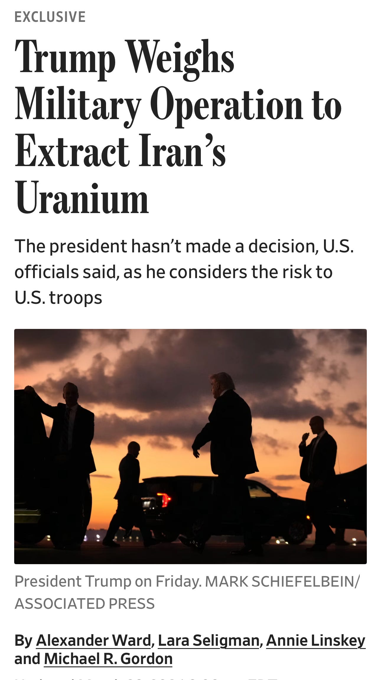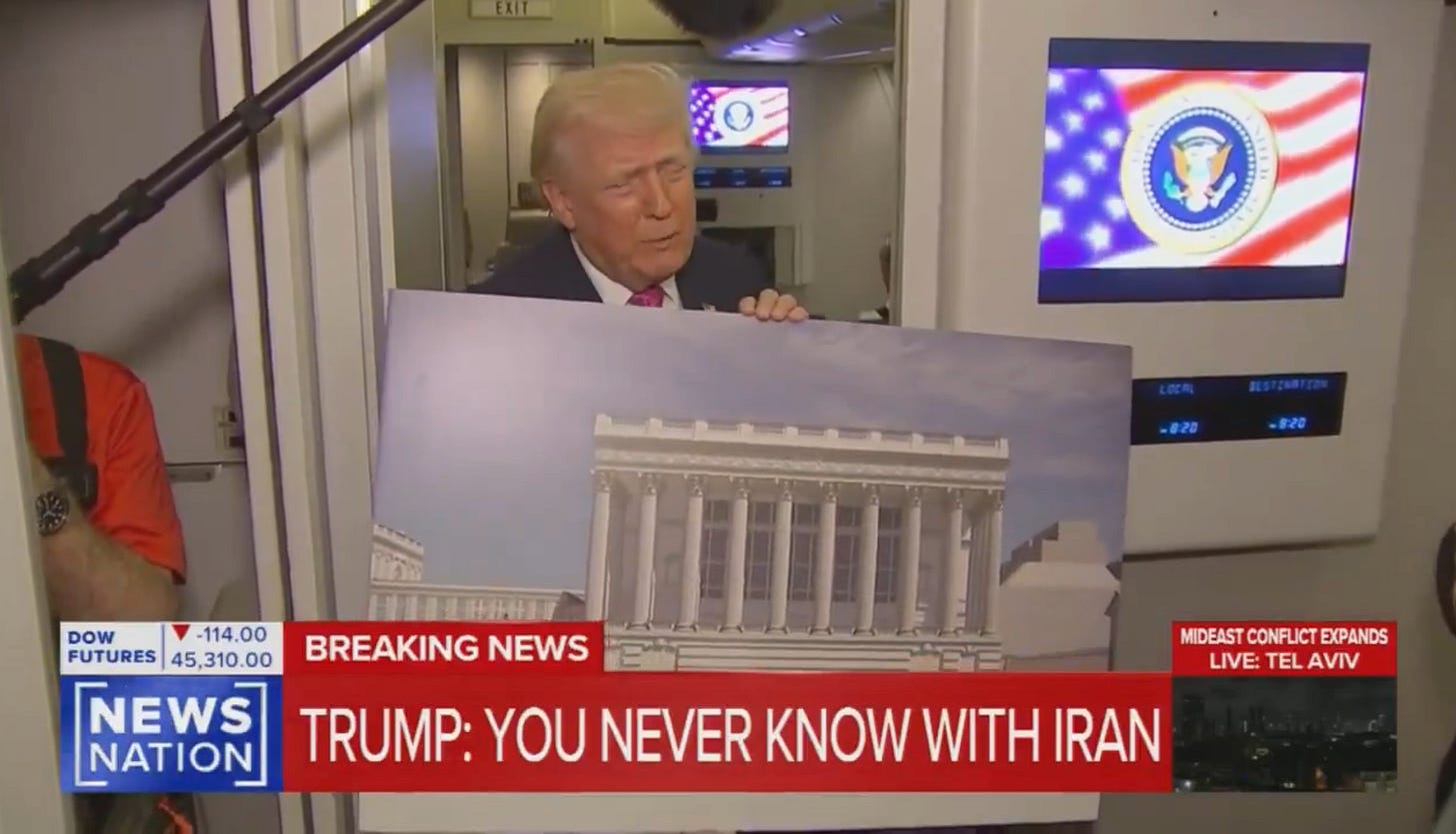 La salle de bal ? Hein ? Je vais y revenir plus tard dans Zeitgeist, vous comprendrez. Restons sur les boots on the ground. Trump disait il y a quelques jours “je n’envoie pas de troupes nulle part”, avant d’ajouter aussitôt “et si je le faisais, je ne vous le dirais certainement pas.” Une phrase purement trumpienne. Dire non, puis laisser entendre que ça pourrait être oui. En coulisses, c’est le sujet du moment. Le Wall Street Journal révèle ce matin que “Trump envisage une opération militaire pour récupérer l’uranium iranien”