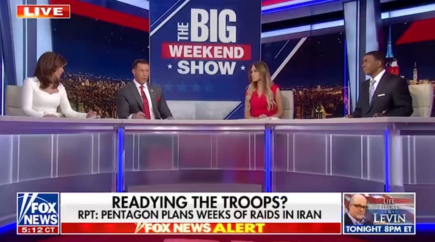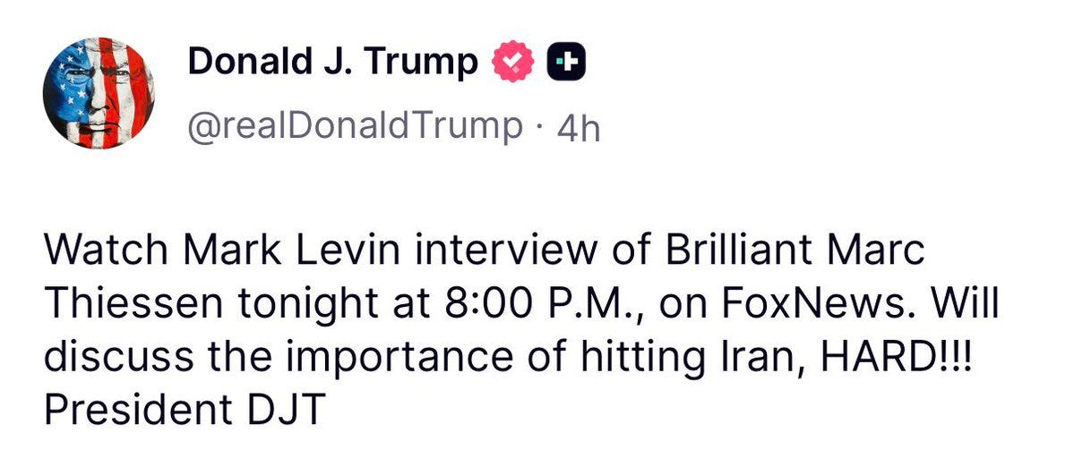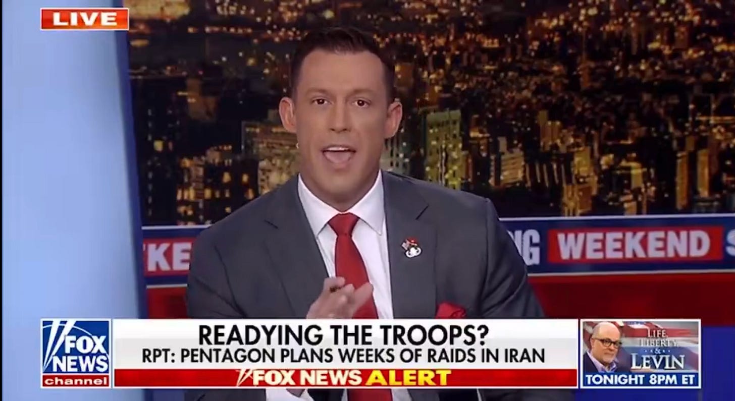 🟨🟧 Le mage de TrumpUn animateur néoconservateur de Fox, qui a convaincu Trump de frapper l'Iran, l'appelle désormais à envoyer des troupes au sol. Il accuse Téhéran d'être lié à Al-Qaïda et au 11 Septembre.