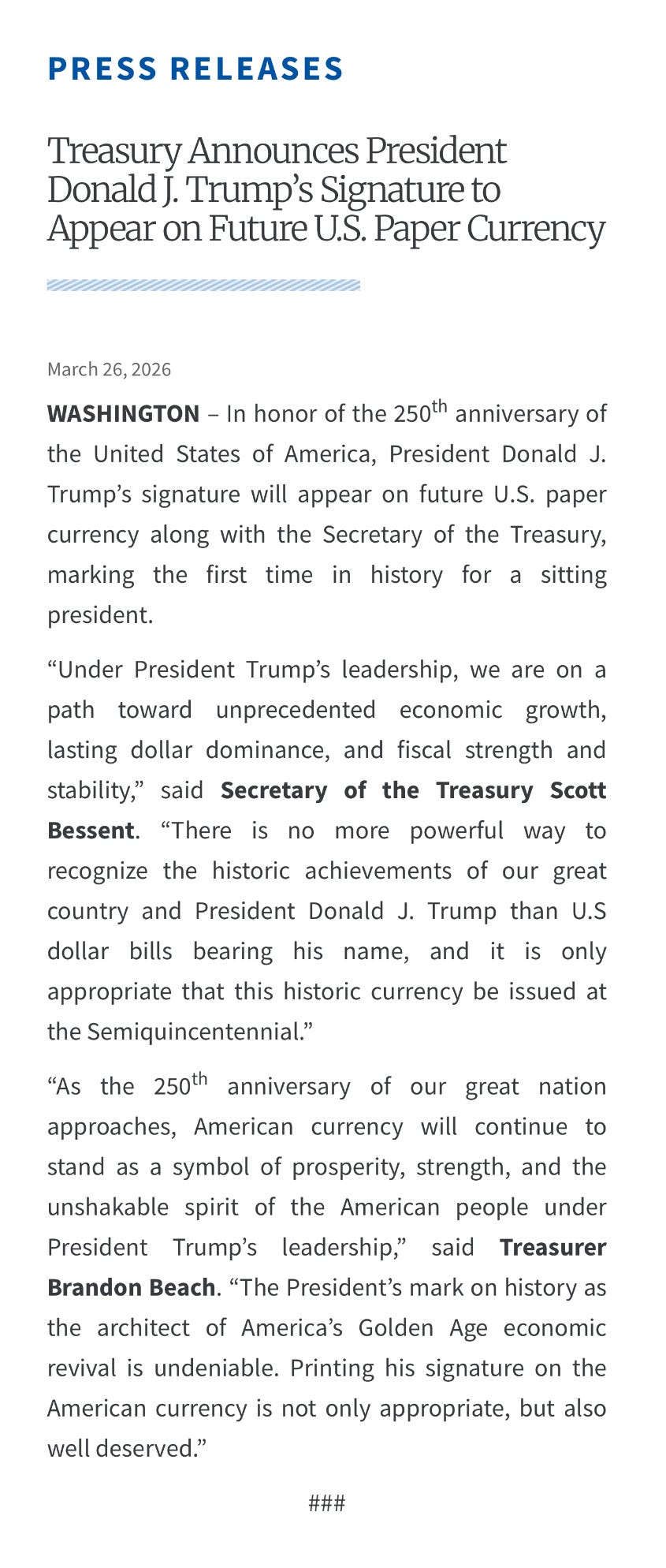 Monnaie monnaie monnaieDonald Trump ne se contente pas d’exercer le pouvoir. Il le signe. Je vous l’ai souvent raconté dans Zeitgeist depuis son retour à la Maison Blanche. Son visage sur des bâtiments publics. Son nom gravé sur les murs de marbre du Kennedy Center à Washington. Du doré, du doré, du doré partout dans les salons de la Maison Blanche. Et désormais, une nouvelle étape, plus personnelle encore, presque tactile. L’argent lui-même. Le Trésor américain annonce que la signature du président apparaîtra bientôt sur les billets en dollars. C’est une première dans l’histoire du pays. Jusqu’ici, depuis le XIXe siècle, les billets portaient les signatures du secrétaire au Trésor et du trésorier des États-Unis. Désormais, celle du président s’y ajoutera et remplacera même celle du trésorier. Une rupture avec une tradition vieille de plus de 160 ans. Les premières coupures, notamment les billets de 100 dollars, doivent être imprimées dans les prochains mois, à l’occasion du 250e anniversaire de l’indépendance américaine. Et ces billets circuleront tant qu’une future administration ne décidera pas de revenir en arrière. Ce geste s’inscrit dans une logique plus large, presque obsessionnelle. Donald Trump, qui aura 80 ans en juin, veut laisser son empreinte. Depuis le début de son second mandat, il multiplie les initiatives pour inscrire son nom dans le paysage institutionnel américain. L’ajout de sa signature sur la monnaie n’est pas un détail. C’est un geste politique. Une manière de lier son identité personnelle à l’un des symboles les plus puissants de l’État. La monnaie circule, se transmet, incarne une forme de permanence. Même si aujourd’hui le cash ne représente plus qu’une petite part des paiements, la valeur symbolique demeure. Chaque billet, chaque pièce, est un symbole. Dans le communiqué officiel du Trésor, le ton est sans ambiguïté. On peut ainsi lire :