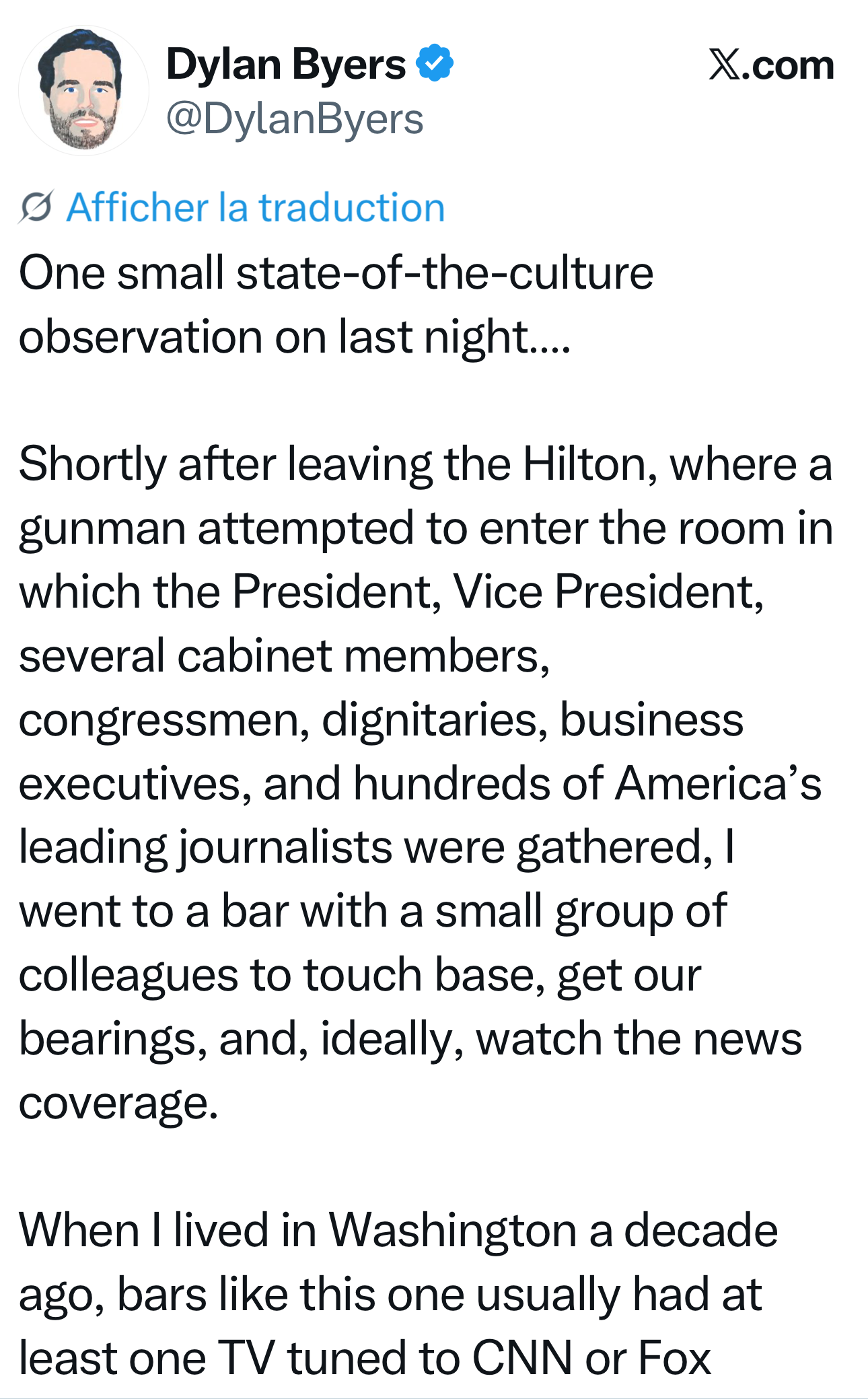 Hi everyone, c’est un Zeitgeist spécial après les tirs en marge du diner des correspondants à la Maison Blanche. Je vais vous raconter en détail ce que révèle le manifeste du tireur, qui voulait s’en prendre à Trump et à son entourage. Il y est question d’Epstein, des “crimes” commis selon lui par Trump en Iran, au Venezuela, et des violences dans des centres de détention pour migrants. Vous allez découvrir ce qu’en dit Donald Trump quand CBS l’interroge sur ce manifeste. Il est furieux. Je vous raconterai aussi ce qui s’est passé dans la salle du Washington Hilton, à travers le récit de Weijia Jiang, assise à la gauche du président quand les coups de feu ont retenti. On verra pourquoi la sécurité pose de vraies questions. Et puis, à peine les tirs entendus, une autre explosion a commencé en ligne. Théories complotistes, récits alternatifs, accusations de mise en scène. Donald Trump devient la cible des mécanismes qu’il a lui-même contribué à installer. Mais d’abord cette photo, diffusée il y a quelques heures par un proche du président. Elle montre Donald Trump de retour dans le bureau Ovale à 22h15 samedi soir, un peu plus d’une heure après l’attaque, découvrant sur un téléphone les premières images du suspect. Il est entouré de certains de ses plus proches collaborateurs et des membres de son administration, le vice-président, le secrétaire d’État, le secrétaire à la Défense, le ministre de la Justice par intérim, le directeur adjoint de cabinet, le directeur du renseignement, jusqu’à Dan Scavino, à gauche, fidèle collaborateur depuis l’époque où il gérait l’un de ses clubs de golf, avant son entrée en politique. C’est lui poste ce cliché pour l’Histoire. Je vais vous faire lire dans un instant in extenso le manifeste du tireur. Une lettre décousue de 1052 mots obtenue par le New York Post, signée “Cole “coldForce” “Friendly Federal Assassin” Allen”. Il y détaille ses “règles d’engagement” pour la fusillade et indique qu’il était de son devoir moral de viser des responsables de l’administration. Il y fait référence à des accusations de crimes de guerre commis par les États-Unis, le bombardement d’une école primaire en Iran, des frappes meurtrières contre des embarcations en mer des Caraïbes et dans le Pacifique, avant l’assaut contre Maduro cet hiver. Et à des accusations d’abus dans des centres de détention pour migrants. Mais la phrase qui me frappe le plus dans cette missive incohérente, c’est une référence à l’affaire Epstein.