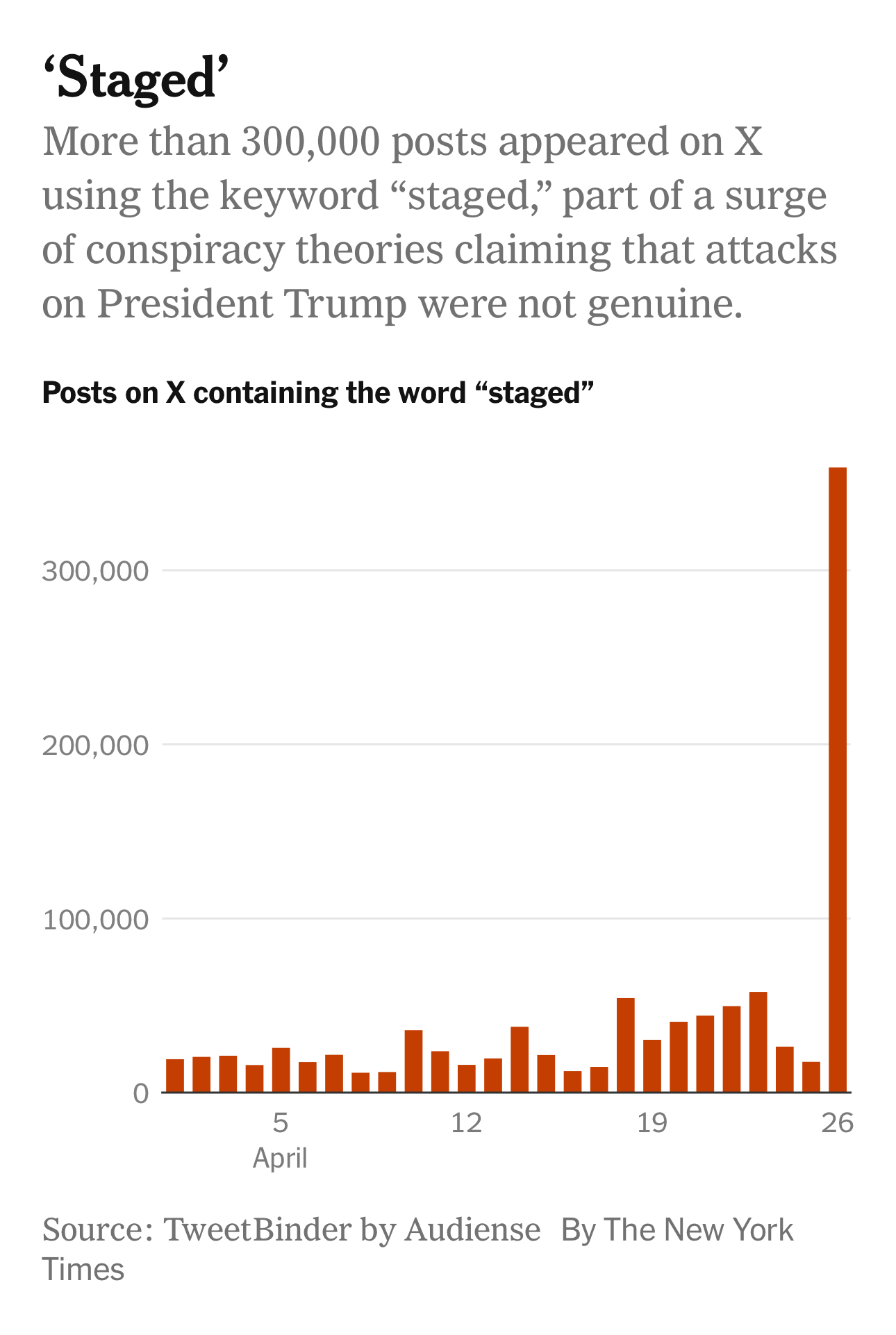 Mis en scène. En quelques minutes, sur X, Bluesky, Instagram ou TikTok, des milliers de messages ont affirmé, sans preuve, que l’attaque était mise en scène. Ce graphique du New York Times montre à quel point ce mot a été utilisé sur les réseaux dans les heures suivantes. Des influenceurs, des militants, de gauche comme de droite, des comptes anonymes ont construit, en temps réel, un récit alternatif. Et totalement fallacieux. Le suspect n’était pas encore clairement identifié, ses motivations inconnues, mais déjà, pour beaucoup, l’histoire officielle ne tenait pas. Le phénomène est désormais classique. Il n’y a plus de temps mort entre un événement et sa contestation. L’information et la suspicion naissent ensemble. Samedi soir, alors que cet homme armé venait à peine de forcer un point de sécurité et d’échanger des tirs avec les forces de l’ordre, alors que le président venait à peine d’être évacué, une autre bataille commençait déjà, sur les écrans. Des théories complètement dingues. La première lie l’attaque à un projet de Trump de bâtir une salle de bal à la Maison Blanche. Le président en parle sans cesse, malgré les controverses, et a évoqué ce projet à nouveau après l’attaque. Pour les conspirationnistes, l’événement visait à faire taire les critiques sur son projet. Absurde. Une autre théorie repose sur une séquence télévisée. Sur Fox News, une journaliste raconte que, juste avant les tirs, le mari de la porte-parole de la Maison Blanche lui aurait dit : “Il faut vraiment que tu sois très prudente.” La connexion coupe. Immédiatement, certains internautes y voient la preuve d’un scénario anticipé. Bon, la journaliste expliquera ensuite que la coupure est due à un problème de réseau et que cette formule “be safe” est très courante dans les conversations. Trop tard. Le doute est installé. Même logique autour de la porte-parole, justement, Karoline Leavitt. Avant le dîner, elle évoque à un micro le discours que le président a prévu pour la presse. Elle a utilisé devant la caméra l’expression “Shots will be fired”, des coups de feu vont être tirés, une manière de dire que les salves du président allaient détoner. Mais après la fusillade dans l’hôtel, la phrase est isolée, sortie de son contexte, poussée sur les réseaux et présentée comme une étrange prémonition. Un simple jeu de mots glisse vers un indice supposé. La mécanique est toujours la même. Des éléments banals, des coïncidences, des fragments de discours remontés et réassemblés pour produire un récit parallèle et fantasque. Et le paradoxe, c’est que ces éléments publics et vérifiables renforcent la crédibilité du récit alternatif. Tout est là, visible, mais réinterprété. Tout cela se répand dans un contexte politique propice. J’ai raconté dans mon dernier livre Armes de distraction massive comment Donald Trump sait mieux que quiconque attirer et détourner notre attention. Certains spéculent donc que l’attaque aurait été orchestrée pour détourner l’attention de la baisse de popularité de Trump, qui atteint des niveaux historiquement bas à six mois des élections de mi-mandat. L’ancienne élue trumpiste au Congrès Marjorie Taylor Greene revient à ses premiers amours conspirationnistes en disant qu’il y a encore “de nombreuses questions” sur le suspect. Ce qui est vrai, mais ne fait qu’alimenter la spéculation dans une base MAGA où Donald Trump a laissé les théories conspirationnistes prospérer. Même les figures les plus connues de la sphère complotiste hésitent. Alex Jones est passé en quelques heures du doute à la conviction que ce n’était pas “staged”. Dans cette bataille des récits, tout est très volatil. Ce qui frappe, ce n’est pas seulement la rapidité de diffusion de ces théories, c’est qu’elles ne sont plus l’apanage d’un camp politique. Elles circulent simultanément dans des écosystèmes idéologiques opposés, chacun y projetant ses propres soupçons. Pour les uns, il s’agit de renforcer Trump. Pour les autres, de manipuler l’opinion ou de détourner l’attention. Le même événement, la même scène, mais des lectures radicalement différentes. Et parfois toutes fausses. Dans l’économie de l’attention actuelle, l’absence d’informations précises est un vide que les récits bricolés à partir du sable viennent immédiatement combler. Le doute n’attend pas. Il se fabrique en direct, à partir de fragments, d’intuitions, de méfiances accumulées. Le dîner des correspondants de la Maison Blanche est censé célébrer la liberté de la presse. Mais ce qui s’y est passé est une illustration presque parfaite de la manière dont la réalité elle-même est désormais contestée, reconfigurée, disputée. Dézoom Cet événement se déroule alors que, ces dernières semaines, des théories complotistes émergent à nouveau à propos de la tentative d’assassinat de Butler en juillet 2024, quand Donald Trump avait été blessé à l’oreille par un tir. Il y avait eu à l’époque des théories conspirationnistes en ligne. À l’époque, elles venaient surtout des marges, souvent hostiles à Trump. Mais ces dernières semaines, elles remontent à la surface… alimentées par son propre camp. C’est désormais dans la sphère MAGA que reprend cette théorie. Depuis plusieurs semaines, des figures influentes de cet écosystème laissent entendre que la tentative d’assassinat de Butler pourrait ne pas être ce qu’elle semble. “Je crois que c’était peut-être une mise en scène”, dit le comédien et podcasteur Tim Dillon, ancien soutien de Trump. Dans un épisode récent, il a suggéré que l’opération aurait pu servir à renforcer la mobilisation électorale en 2024. D’autres adoptent une stratégie plus indirecte. Comme Marjorie Taylor Greene, qui écrit qu’elle ne veut pas pa