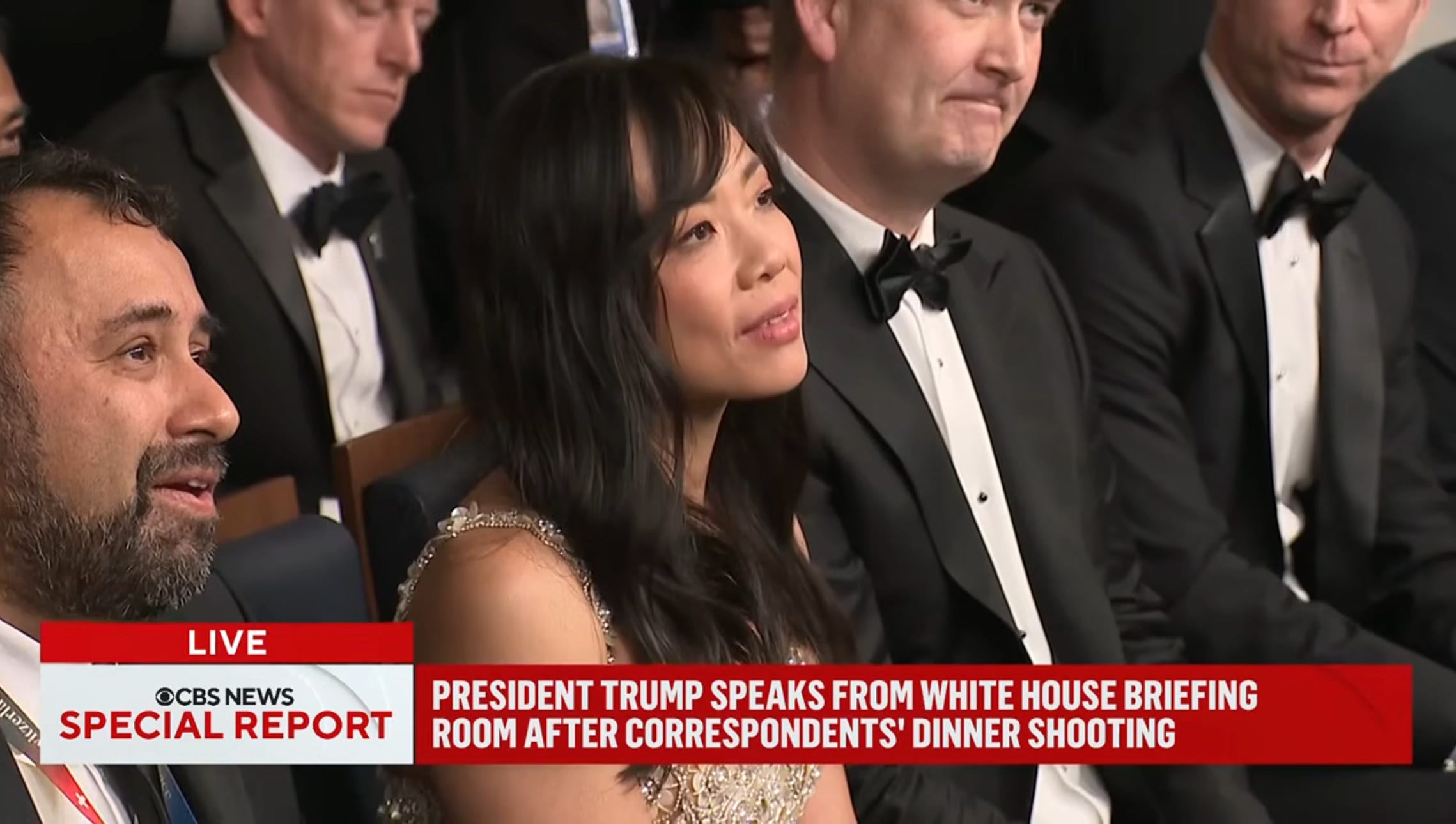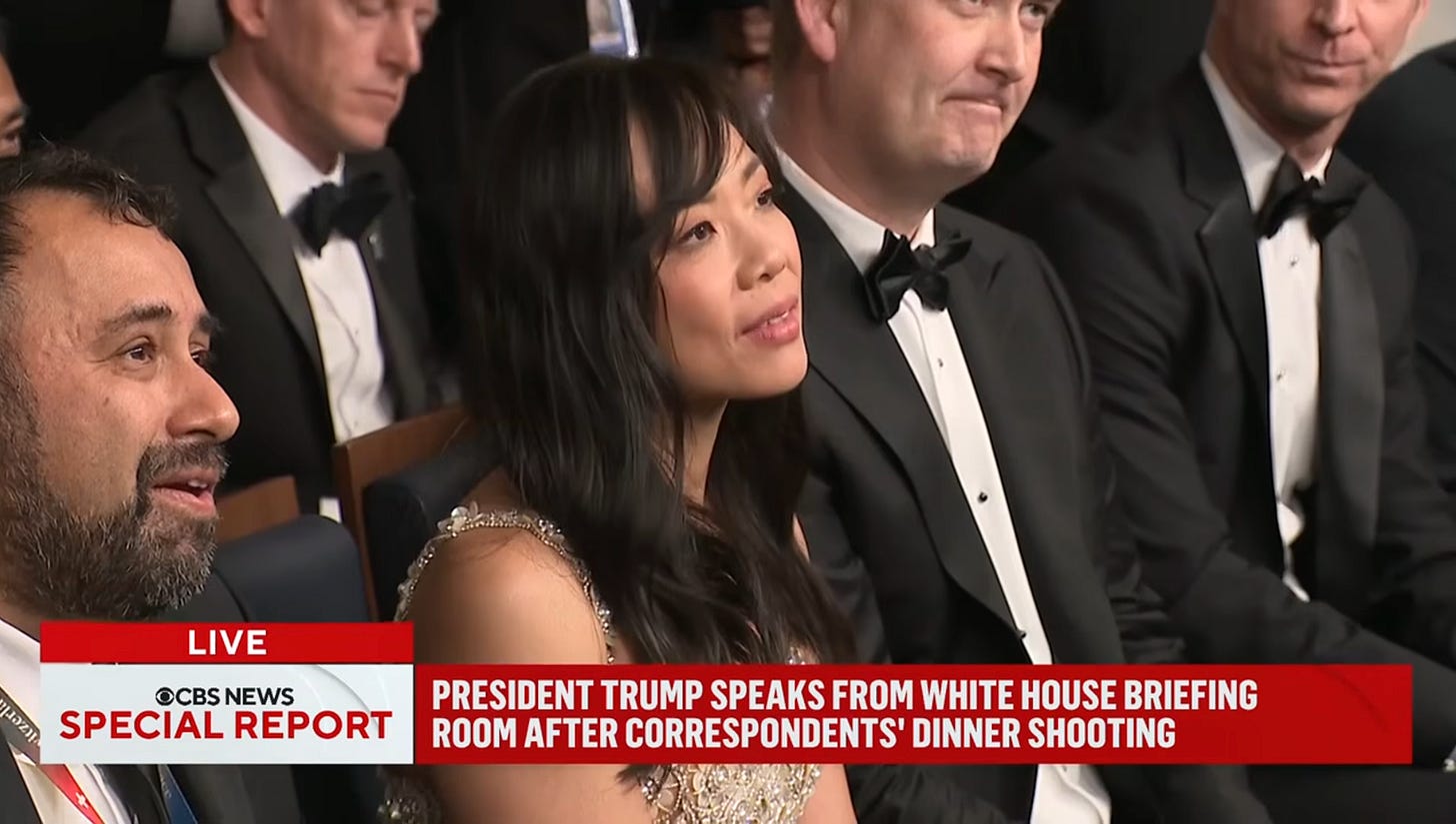 Je referme ce souvenir de 2020 pour revenir à cette soirée. J’ai reconstitué le récit à partir des déclarations de Weijia Jiang depuis samedi soir, sur scène après l’événement, au téléphone, puis à la Maison Blanche en direct dans l’édition spéciale de CBS présentée par Tony Dokoupil, qui n’a pas eu le temps de changer son smoking après avoir accouru au studio. Elle l’a aussi raconté hier dans l’émission politique, sur le site de CBS. Et à nouveau hier soir depuis le journal télévisé, le CBS Evening News, en direct depuis les jardins de la Maison Blanche. Ce dîner devait être un moment de normalité. Comme je vous l’avais raconté dans le dernier Zeitgeist, c’est la première fois que Donald Trump y assiste comme président. C’était le souhait de Weijia Jiang, et elle a tenu bon face aux critiques sèches de nombreux confrères, y compris Dan Rather, ancienne légende de sa chaîne CBS, qui contestait qu’il soit possible de célébrer la liberté de la presse avec un président qui la piétine. Mais Jiang espérait “rétablir une forme de normalité entre l’administration Trump et la presse”, comme elle l’écrivait il y a quelques heures sur le site de CBS News.